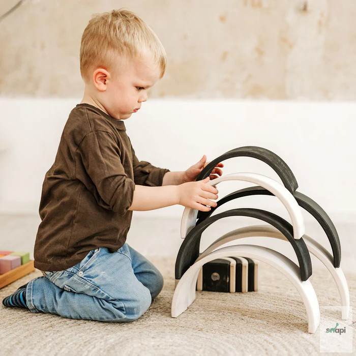 A Nagy Szivárványos Monokróm játékunk igazi sokoldalú játék. Természetesen remekül mutat a polcon, de a benne rejlő teljes potenciál csak akkor mutatkozik meg igazán, ha szétszeded részeire, és elkezded használni. Készen áll mindenféle fantázia táj rakására és megépítésére, kis játékvilágok létrehozására, könnyű vagy trükkös labdapályák kitalálására, sokoldalú szerepjátékokban való felhasználásra, szórakoztató flatlay játékok lefektetésére, a színek megismerésére és válogatására, valamint az energia leadására az aktív mozgásos játék során. Ez talán túlzásnak hangzik, de nem az - ígérjük! ;) Monokróm játékainkat a forma és a szín maximális redukciójával terveztük. A monokróm játéksorozat nagy színkontrasztja, valamint texturált felületei pedig segítenek az egyéni igények fejlesztésében. A látássérült gyermekeket egy láthatóbb világ felismerése motiválja a körülöttük lévő világ felfedezésére. Ezek a multiszenzoros játékok egyszerű formákkal, nagy kontrasztú színezéssel segítik az egyes érzékek fejlesztését és stimulálását.