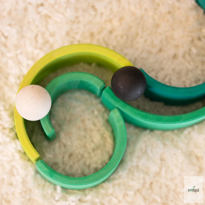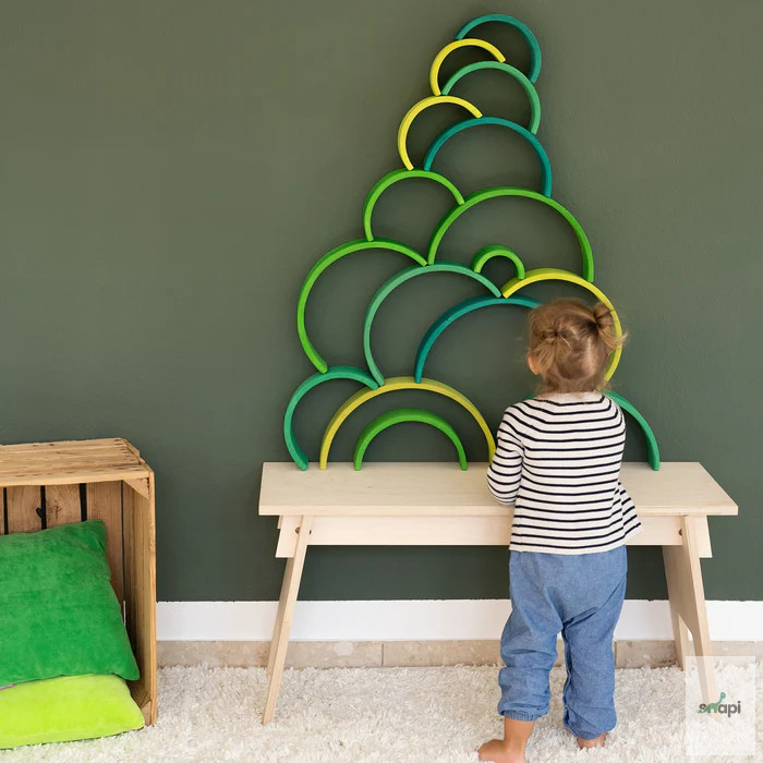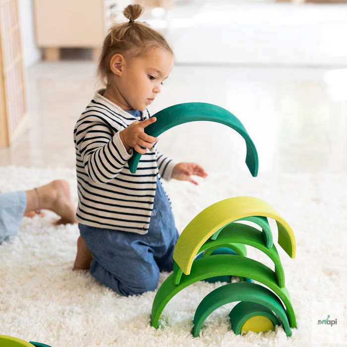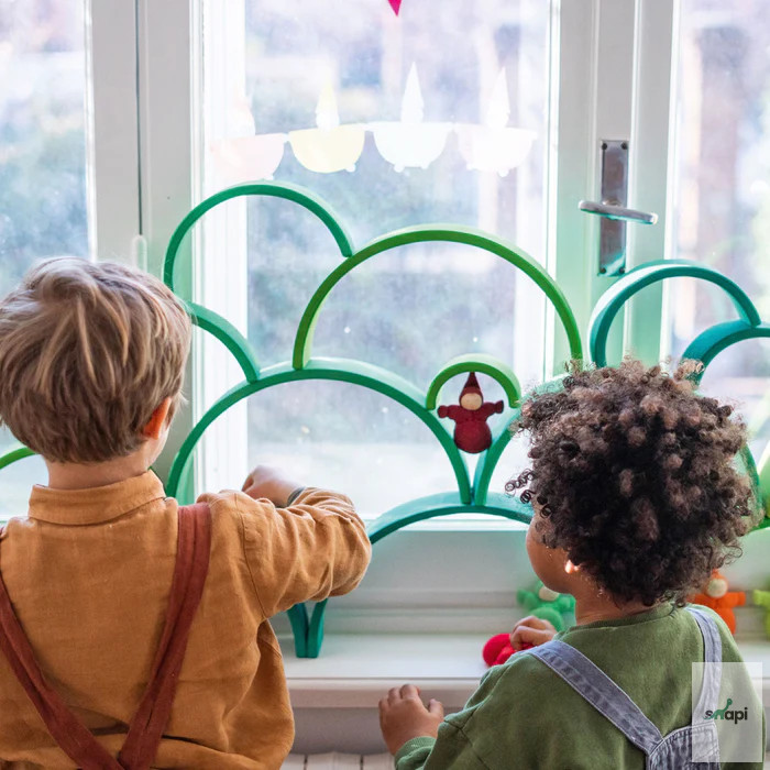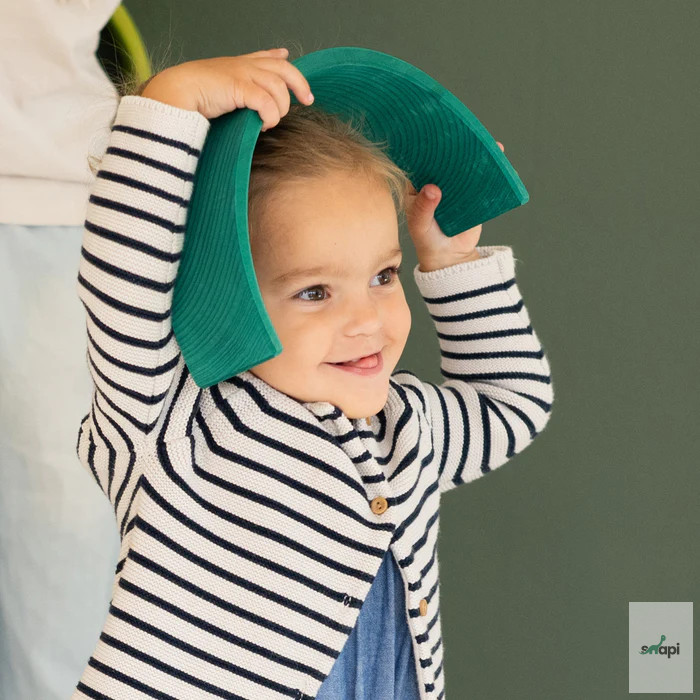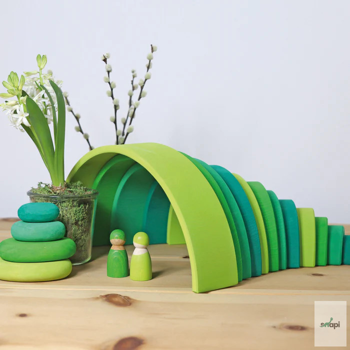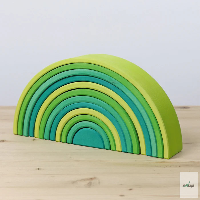 Természetesen remekül mutat a polcon, de a benne rejlő teljes potenciál csak akkor mutatkozik meg igazán, ha szétszeded részeire, és elkezded használni. Készen áll mindenféle fantázia táj rakására és építésére, kis játékvilágok létrehozására, könnyű vagy trükkös labdapályák kitalálására, sokoldalú szerepjátékokban való felhasználásra, szórakoztató flatlay figurák fektetésére, a színek megismerésére és válogatására, valamint az aktív mozgásos játék során az energia leadására. Ez talán túlzásnak hangzik, de nem az - ígérjük! ;) Mindazok számára, akiknek a szíve a tavaszi napsütésért és a tél végéhez közeledő gyönyörű tavaszi zöld árnyalatokért dobog, ez a szivárvány a megfelelő választás. Kis játékvilágok hozhatók létre, amelyek a növények első, zsenge hajtásaira emlékeztetnek májusban, túlnyomórészt világoszöld árnyalataikkal, a buja nyári napsütéses rétek színeivel kombinálva. Szülői tipp: A szabad játék ösztönzése érdekében azt javasoljuk, hogy ne az összeszerelt Szivárványt tegyétek játékra, hanem az egyes íveket dobjátok vadul egy kosárba. Így a darabok inkább építőanyagként jelennek meg, és az összeállított szivárvány képe nem befolyásolja a képzeletet a többi játék és építési lehetőség szempontjából. 12 darab.