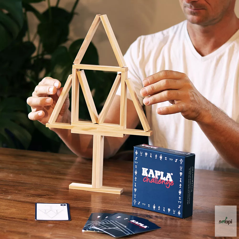 A KAPLA ® Challenge egy új játék a KAPLA ® kínálatában. Koncentráció és kitartás szükséges a tökéletes egyensúly eléréséhez. Ahogy végigjátszod a kártyákat, a szerkezetek egyre bonyolultabbá válnak. Logikát és kreativitást kell használnod, hogy megtaláld a módját, hogyan tarthatod egyensúlyban a kihívást!