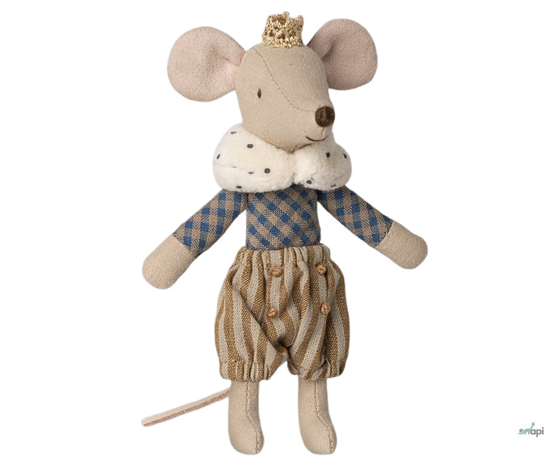 Igazi hercegegér nagytestvér méretben. A legszebb ruháiba van öltözve, gyönyörű részletekkel és arany koronával. Tökéletesen illik a Maileg-kastélyba.