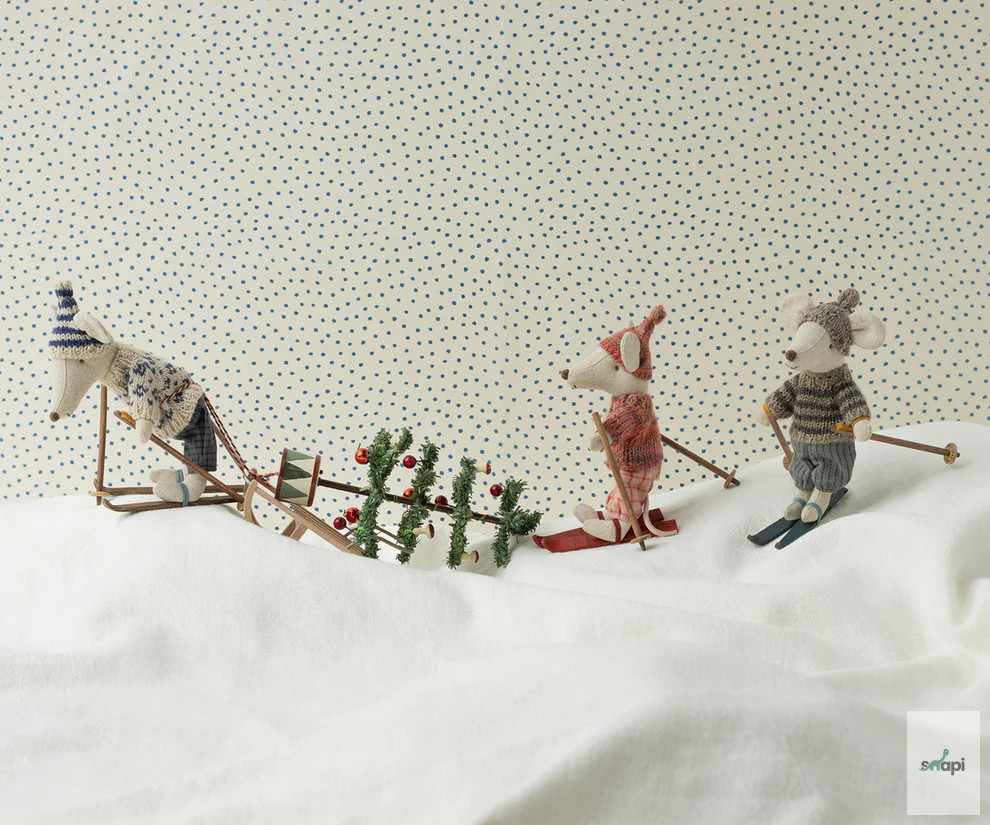 Egy egér, aki órákon át tartó szórakozásra készen áll a lejtőkön a hideg téli időszakban. Minden játékkészlet tartalmaz egy melegen felöltözött egeret, sílécet és síbotokat. Nézd meg ezt az apró kötött sapkát, amely melegen tartja a füleket.