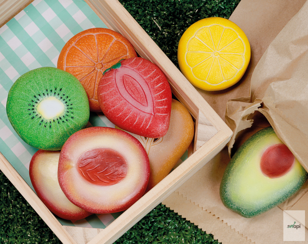 A készlet nyolc színes gyümölcsöt tartalmaz: almát, körtét, őszibarackot, epret, avokádót, kivit, narancsot és citromot. Méretek: 45-70 mm. 2 éves kortól biztonságos.