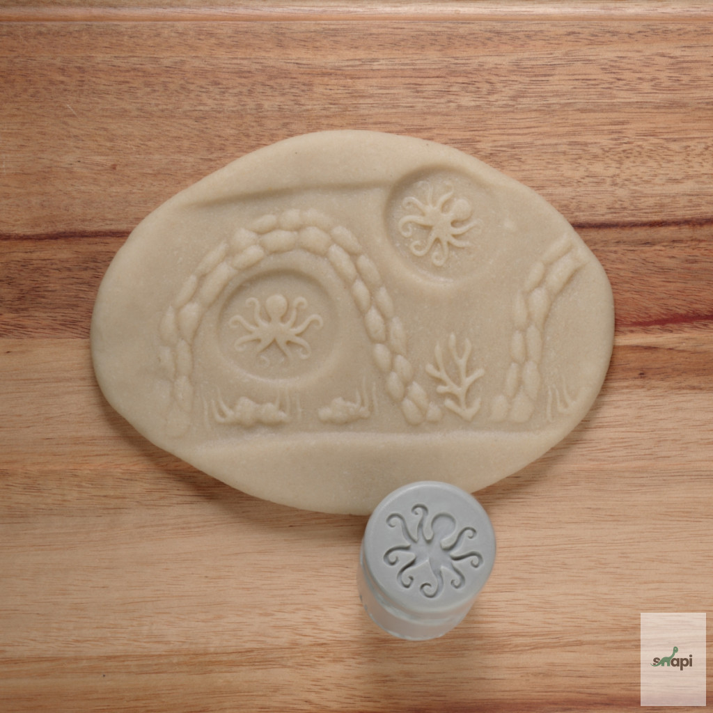 Fedezd fel az értékes és csábító óceáni élőhelyeket ezzel a kreatív hengerkészlettel. Hamarosan hullámokat fogsz kelteni, miközben gyurmába vagy agyagba görgeted a játékot, és a bélyegzők segítségével életre kelted a vizet különféle tengeri élőlényekkel. Számold meg a vízben merülő delfineket, kövesd a halakat a buborékokon keresztül, és alkoss tapintható történetmeséléseket a teljes szereplőgárdának! Miért ne használnád ezt az eszközt ugródeszkaként érdekes tények és új szókincs elsajátításához? A gyerekek újra és újra gyakorolhatják a különböző nyomáserősségek használatát és a hengerlés különböző módjait.