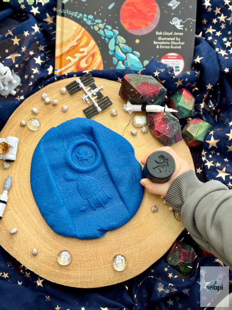 A gyerekek űrhajós expedícióra indulhatnak, miközben a gyurmába gurulnak és taposnak, hogy lenyűgöző tapintható jeleneteket tárjanak fel, többek között űrhajósokat, rakétaindításokat, űrsétákat és egyebeket. Ez a készlet tökéletes a beszélgetések elindításához, segít a gyerekeknek megismerni a Föld és más bolygók közötti különbségeket, az űrutazás fontosságát, és azt, hogy ez hogyan gazdagítja a világról alkotott ismereteinket. Játékon keresztül a gyerekek elmélkedhetnek a Föld szépségén, és felfedezhetik, hogyan gondoskodhatnak róla.