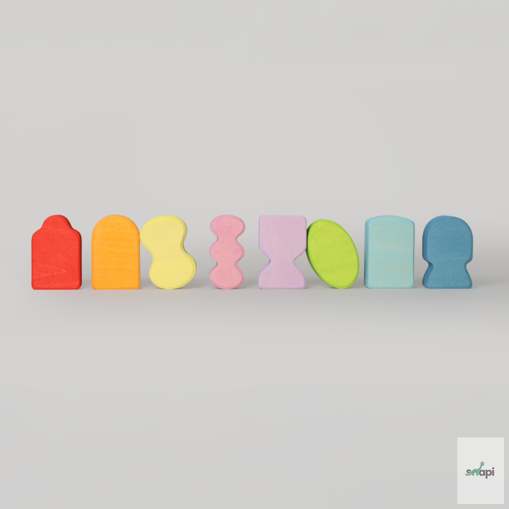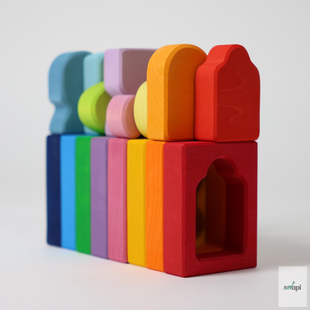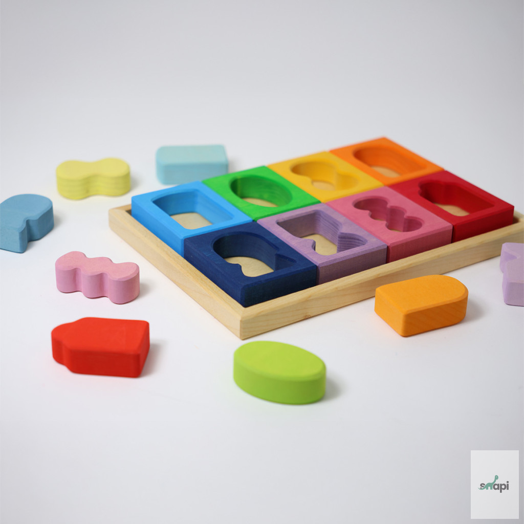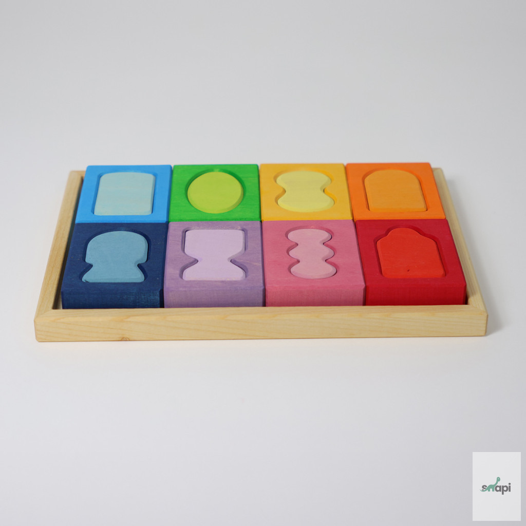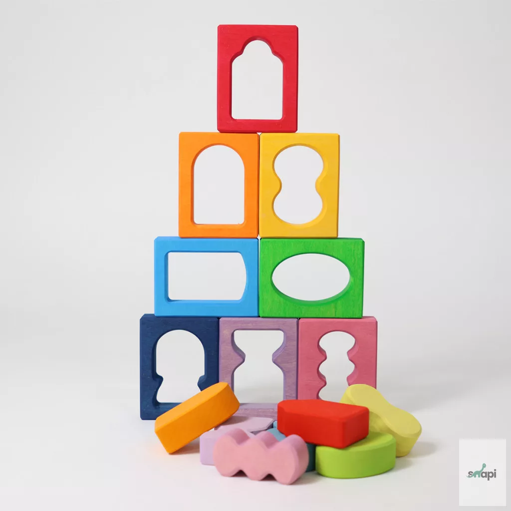 Windows give us a view of the world. Our windows in various colours and shapes are essential building elements for all types of buildings. They bring light into dark rooms and enliven monotonous facades. The Building Set is a first shape puzzle to introduce young children to matching shapes and colour harmonies. Wood: lime wood, colour glazedFrame: 18.6 x 26.6 cmBuilding blocks: 2 cm thick