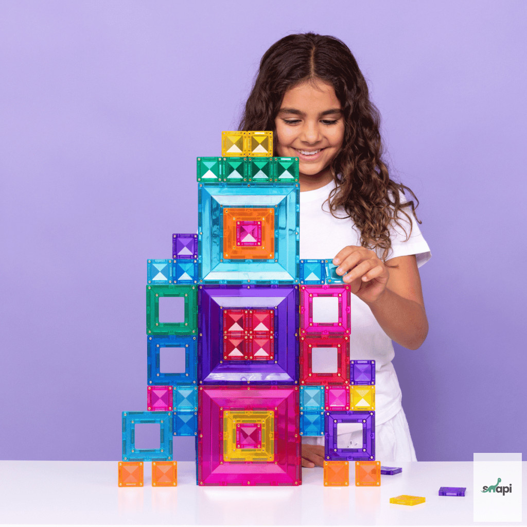 Ez a csomag nyolc ragyogó színben, három különböző méretű négyzetet tartalmaz, amelyek tökéletesen egymásba illeszkednek, hogy a nyílt végű játékot és a STEAM tanulást teljesen új szintre emeljék. A nagy és standard mágneses építőelemek egyedi, nyitott keretes kialakításuknak köszönhetően innovatív építési lehetőségeket kínálnak: belső és külső éleken is több mágneses csatlakozási ponttal rendelkeznek. A mini négyzetek pedig a CONNETIX Smart-Spin technológiát mutatják be, amely lehetővé teszi, hogy a mágnesek akár 360 fokban forogjanak az elemen belül, így új irányokban, izgalmas konstrukciók születhessenek.