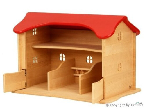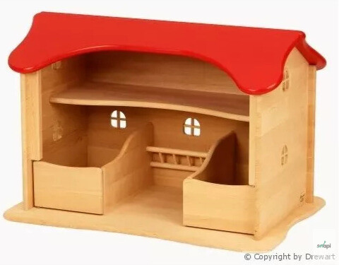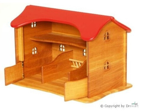 The Drewart barn with its red roof is a wonderfully large wooden barn, perfect for housing your favorite cows, sheep, donkeys or horses. The other pets can be upstairs, but it can also be furnished as an apartment for the farm dwellers due to its large size.