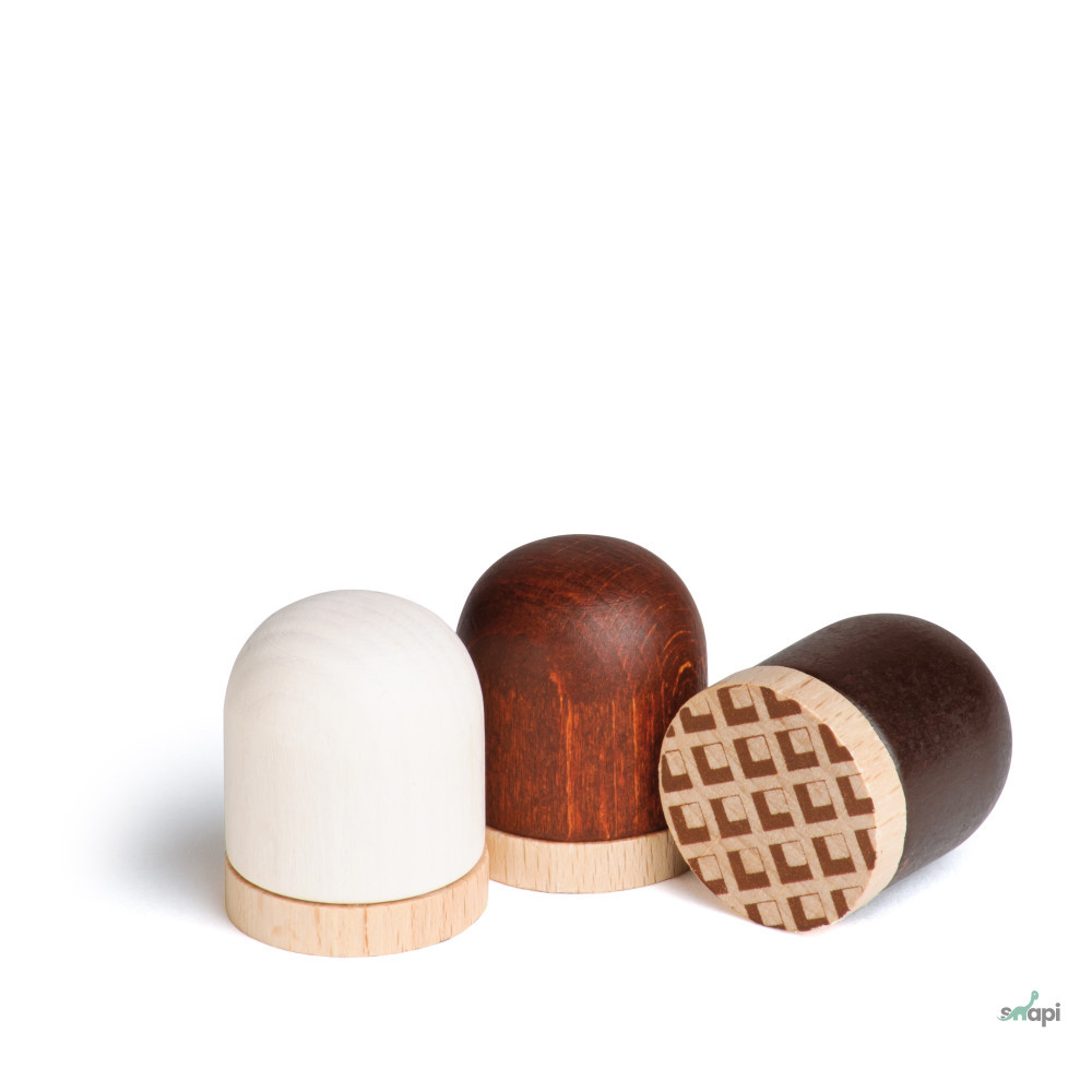 3 db fából készült mini mályvacukor, három különböző színben, dekoratív fémdobozban.