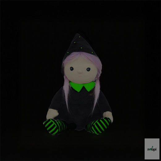 • Posable body with gentle weighting inside for the perfect snuggle. This Willa comes with glow-in-the-dark tights, collar and embroidery on her hat.