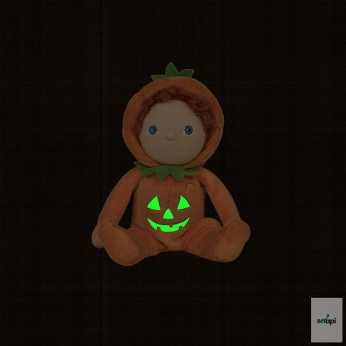 Dressed in a velvety orange onesie with a leafy green collar and a hood that flips up or down, Jack’s outfit is pure autumn magic. His soft, posable body makes him perfect for cuddles, adventures, and sneaky hideaways. Whether he’s peeking out from a trick-or-treat basket or showing off his glowing pumpkin design, Jack O’Lantern brings a festive sparkle to every playtime.