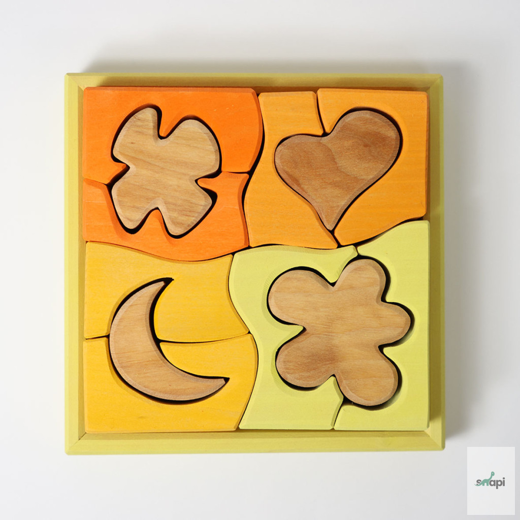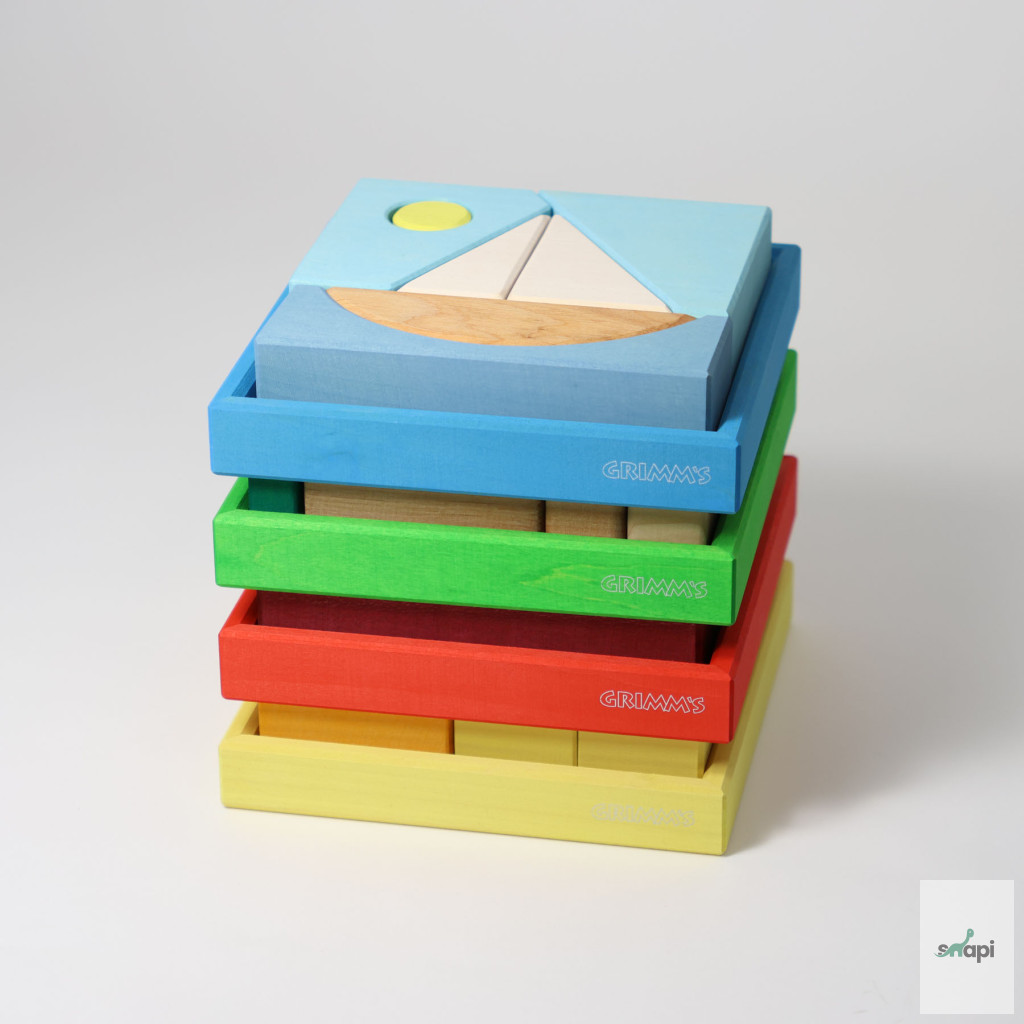 Yellow like ... summer. Symbols full of vibrancy meet warm yellow tones full of positive energy. Outside the frame, the organic building blocks become artistic and summery flower meadows. Building Set Yellow is part of our four Colour Building Sets. With their large pieces, they are made for the smallest hands. The colour variations provide an initial introduction to the primary and secondary colours and their different effects.
