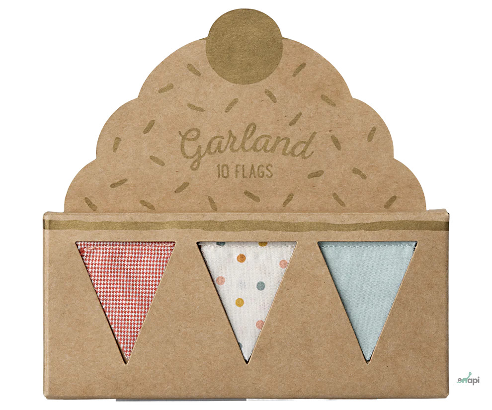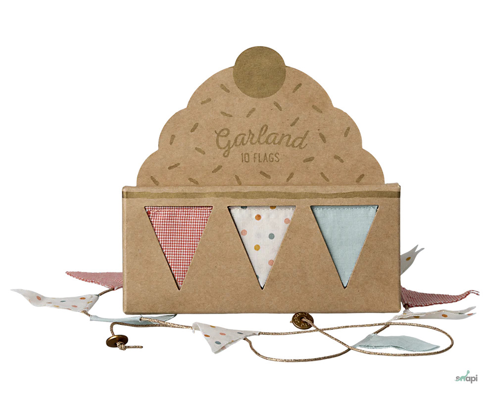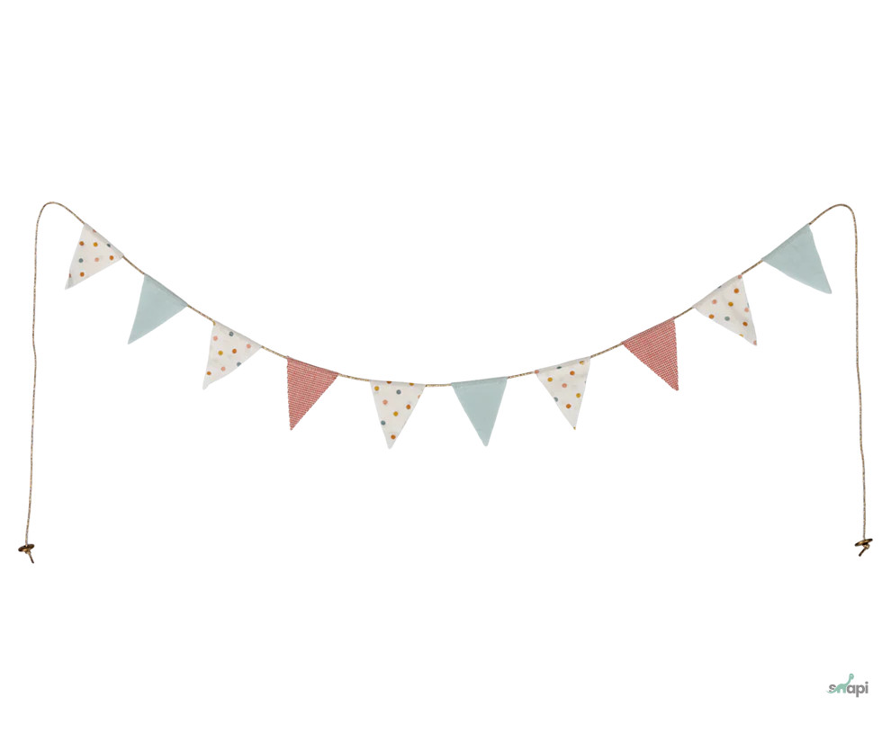 Új, zászlókkal díszített girland Maileg anyagból. Tökéletes a gyerekszoba bármely pontjára. 10 zászlót és 2 db logós érmét tartalmaz a végén. Hossza 115 cm.