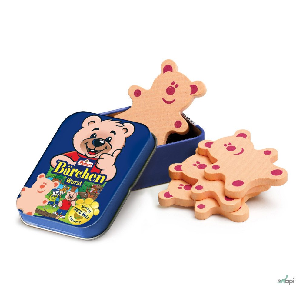 4 darab fából készült kolbászszelet a híres Reinert medve formájában, szépen megtervezett fém dobozban.